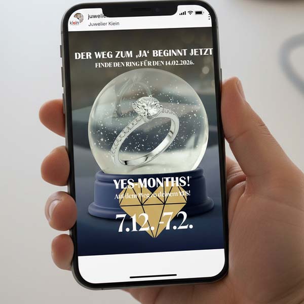 Der Verlobungsring-Experte verbindet lokale Beratung mit nationaler Kampagne. Mit dem YES-DAY! am 14. Februar wird der Valentinstag als Antragstag positioniert – der Umsatz aber entsteht in den Wochen davor. Der sogenannte YES-MONTH!, also Dezember und Januar, ist die Hauptzeit für Beratung und Verkauf. Das Motto lautet: „Der Antragstag steht fest – Ihre Verkaufszeit auch.“ Wer im YES-MONTH! nicht aktiv ist, verpasst den Verkauf. Durch Social-Media-Vorlagen, lokale Aktionen und Google-Marketing führt das Programm gezielt Frequenz in die Geschäfte.