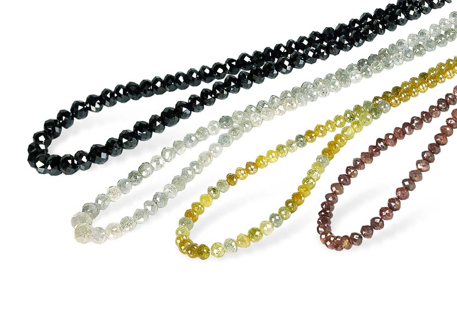 Diamantstränge in verschiedenen Farben sowie Edelsteinstränge in verschiedenen Schliffen. © A. Ruppenthal