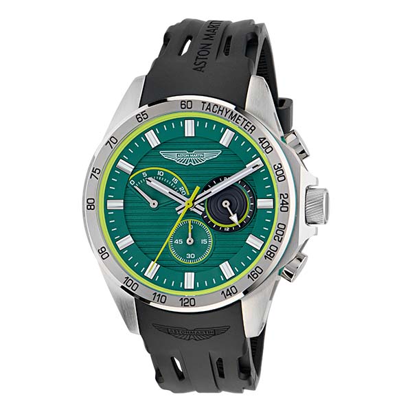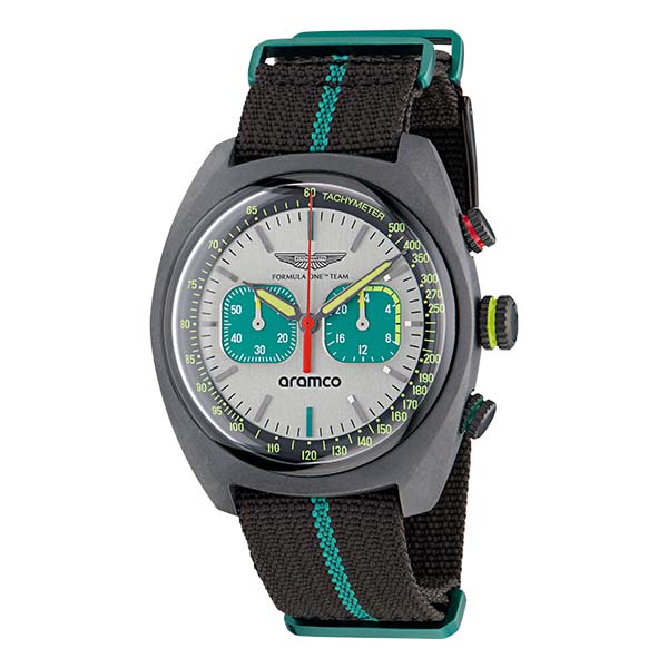 Aston Martin F1 Team: Herren-Chronograph, 46mm Gehäuse aus schwarzem Kunststoff, wasserdicht bis 10 bar, japanisches Präzisions-Quarzwerk, zweifarbiges Silikon-Armband // Aston Martin F1 Team: Herren-Chronograph, 43 mm-Gehäuse aus Carbonfaser, wasserdicht bis 10 bar, japanisches Präzisions-Quarzwerk, robustes Nylon-Nato-Armband © Aston Martin