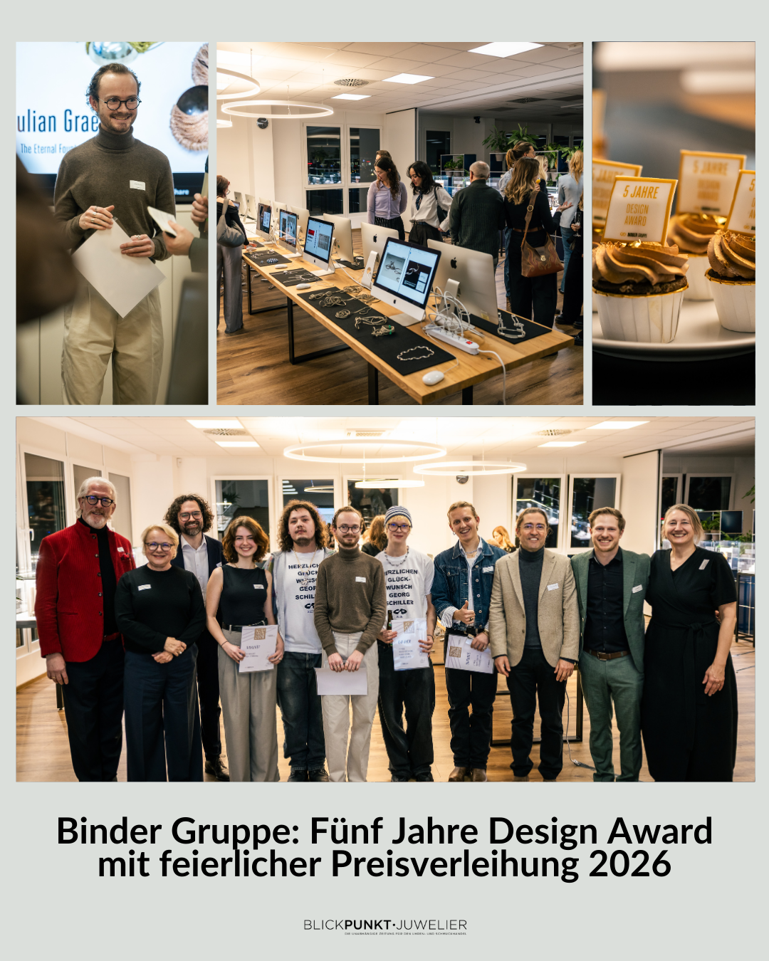 Mit der Verleihung des diesjährigen Design Awards feierte die BINDER Gruppe gemeinsam mit der Hochschule für Gestaltung aus Pforzheim ein besonderes Jubiläum: Bereits zum fünften Mal wurde der renommierte Nachwuchspreis für herausragende Schmuckkreationen vergeben. Seit fünf Jahren steht der Design Award für den intensiven kreativen Austausch zwischen Studierenden und der Schmuckindustrie.