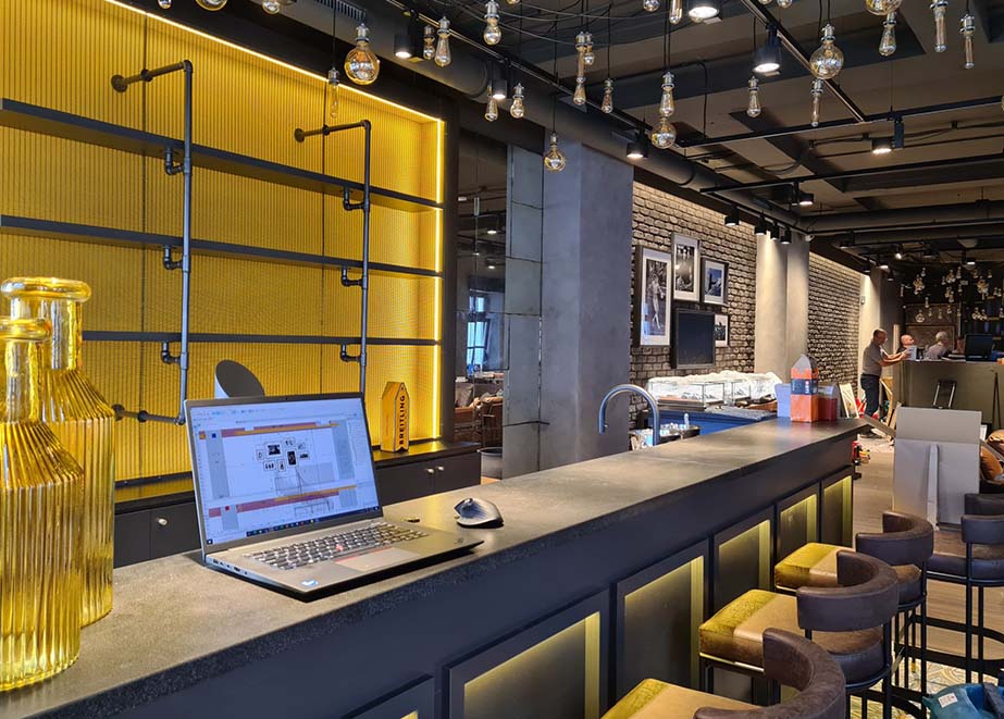 Die Münchner Boutique unterstreicht diesen Ansatz auch gestalterisch. Materialien, Licht und Architektur sind gezielt darauf ausgerichtet, eine emotionale Verbindung zu schaffen. Historische Fliesenmuster mit Bezug zur deutschen Gestaltungstradition werden neu interpretiert und mit der Markenidentität verknüpft. Gleichzeitig erzeugen Elemente wie eine Bar aus recyceltem Holz und warme Lichtinszenierungen eine Atmosphäre, die an einen hochwertigen, modernen Biergarten erinnert. Der Raum wirkt bewusst vertraut und lokal verankert, ohne an internationaler Markenästhetik zu verlieren. „Es ging nicht nur darum, eine schöne Einzelhandelsfläche zu schaffen, sondern ein Gefühl von Ort, Kultur und Identität“, so die Retail-Designer von Breitling.