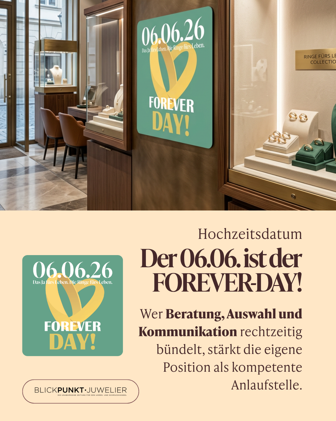 Für Juweliere muss deshalb klar sein: Der FOREVER-DAY! ist nicht der Tag, an dem Trauringe verkauft werden. Er ist der Tag, an dem geheiratet wird. Der Umsatz entsteht vorher. Genau dafür sind die FOREVER-WEEKS vom 01.05.2026 bis 31.05.2026 da. In dieser Phase informieren sich Paare, vergleichen Anbieter, prüfen Bewertungen und vereinbaren Beratungstermine. Hier fällt die Entscheidung, welcher Juwelier den Auftrag erhält. Wer in diesen Wochen sichtbar und überzeugend auftritt, erhöht seine Chancen auf Abschluss und Marktanteil deutlich.
