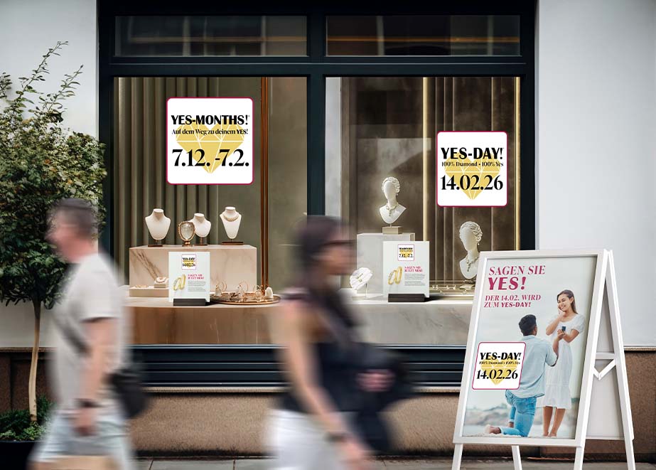 Das Programm Verlobungsring-Experte (VEX) bringt Struktur in das Verlobungsgeschäft. Teilnehmende Juweliere erhalten Kampagnenmaterial, Schaufensterkonzepte und Social-Media-Vorlagen, die exakt auf den YES-MONTH! (7.12.–7.2.) abgestimmt sind. So entsteht eine koordinierte Kommunikation, die Aufmerksamkeit erzeugt, bevor die Nachfrage ihren Höhepunkt erreicht.