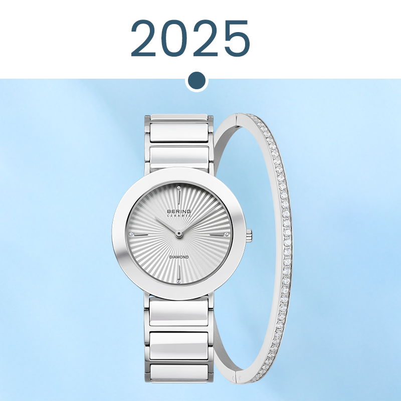 Zum Jubiläum präsentiert BERING ein exklusives Set (Titelbild), das die Designphilosophie der Marke eindrucksvoll widerspiegelt: Die Uhr 17724-010 mit silberfarbenem Milanaisearmband, goldfarbenem Gehäuse, glänzender Bicolor-Optik und einem echten Diamanten auf dem Zifferblatt wird kombiniert mit dem passenden Edelstahl-Armband 660-127-X0. Dieses überzeugt mit glanzvollen Kristallglas-Steinen und einem harmonischen Bicolor-Design in den Farben Silber und Gold. Das Jubiläums-Set 17724-010-GWP ist zum Sonderpreis von € 139 erhältlich (statt € 188, Armband im Wert von € 49 gratis).