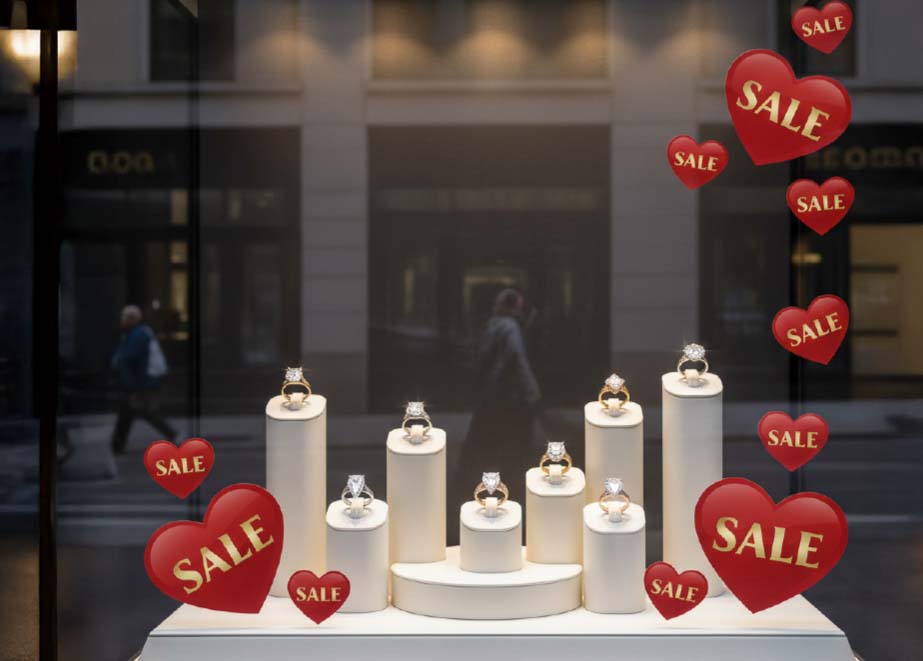 Schaufenster. Ein eigenes Verlobungsring-Schaufenster signalisiert sofort Kompetenz und Fokus. Klare Botschaften, ruhige Präsentation und emotionale Gestaltung holen den Kunden genau dort ab, wo die Online-Suche endet: im echten Moment des Erlebens. So wird das Schaufenster zur Bühne für den ersten Ring. // Sonderdeko. Sonderdekorationen verwandeln den Verkaufsraum in eine Bühne für Emotionen. Mit gezielten Farben, Licht und Materialien entsteht Atmosphäre, die den Moment des Antrags spürbar macht. Ob florale Akzente, saisonale Themen oder elegante Displays: eine durchdachte Präsentation zieht Blicke an und lässt den Verlobungsring im richtigen Umfeld wirken. © Google AI Studios