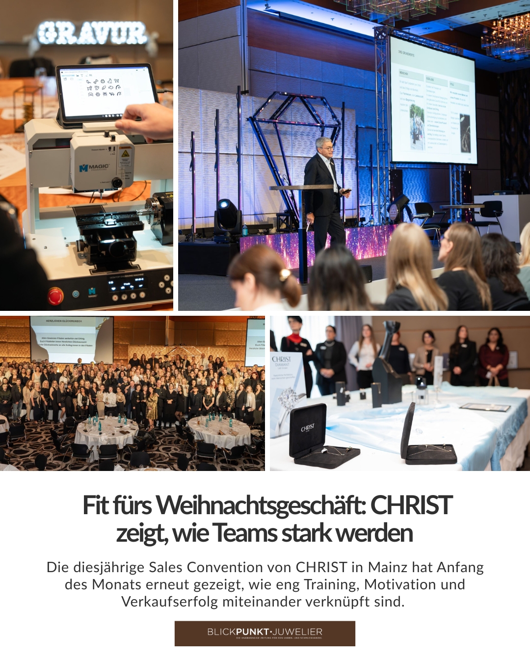 Filialleitungen prägen täglich die Beratungsqualität und die Atmosphäre auf der Verkaufsfläche. CHRIST setzt deshalb konsequent auf regelmäßigen Austausch, interne Wissensupdates und praxisorientierte Schulungen. In diesem Jahr standen Sortiments- und Kollektionswissen, etwa zur eigenen LabGrown-Kollektion, ebenso im Fokus wie Trainings zu Diamantkunde, Gravur oder Service. Gerade im Weihnachtsgeschäft entscheidet dieses Wissen oft über höhere Durchschnittsumsätze und bessere Abschlussquoten.