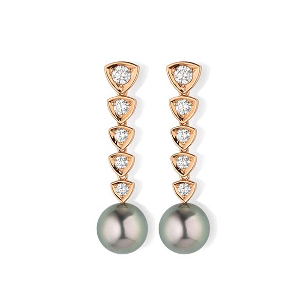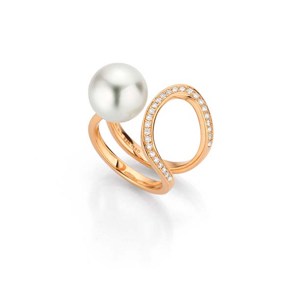 Ohrstecker aus der Linie WAVE. 750 Rosé Gold mit 10 Brillanten und 2 Marutea Zuchtperlen. Dazu der passende Ring. Ring aus der Linie WAVE. 750 Rosé Gold mit 4 Brillanten und einer Marutea Zuchtperle. © Gellner