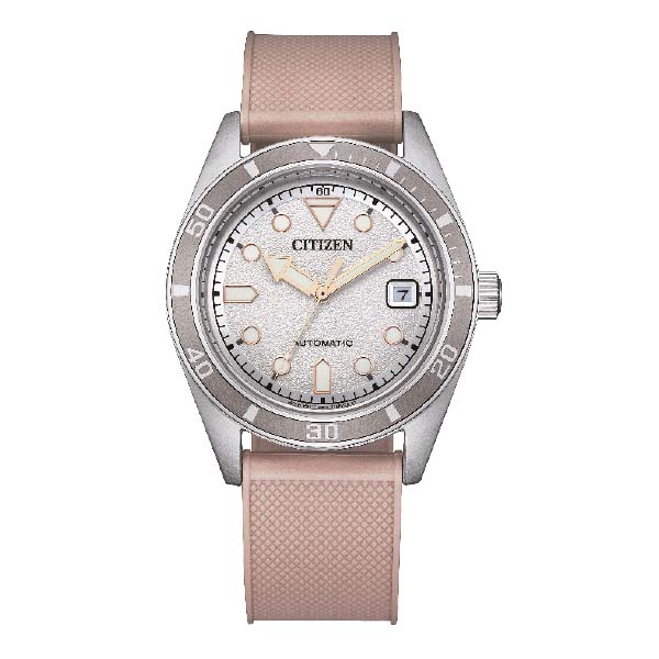 Automatik Diver NJ0229-07A: Unisex-Uhr im Diver-Stil, 38,5mm, hauseigene Kaliber 8210 mit Datum, weißes Zifferblatt, pinkfarbenes Urethan-Band // Automatik Dress Watch NJ0210-05E: Unisex-Uhr, 40mm, Automatikwerk 8210 mit 40 Stunden Gangreserve, Lederband mit Dornschließe, wasserdicht bis 5 bar // Vintage Racing Chronographen CA4714-04A: Vom Motorsport inpirierter Chronograph, Eco-Drive-Kaliber B620 mit Datum und Totalisatoren auf 3, 6 und 9 Uhr © Citizen