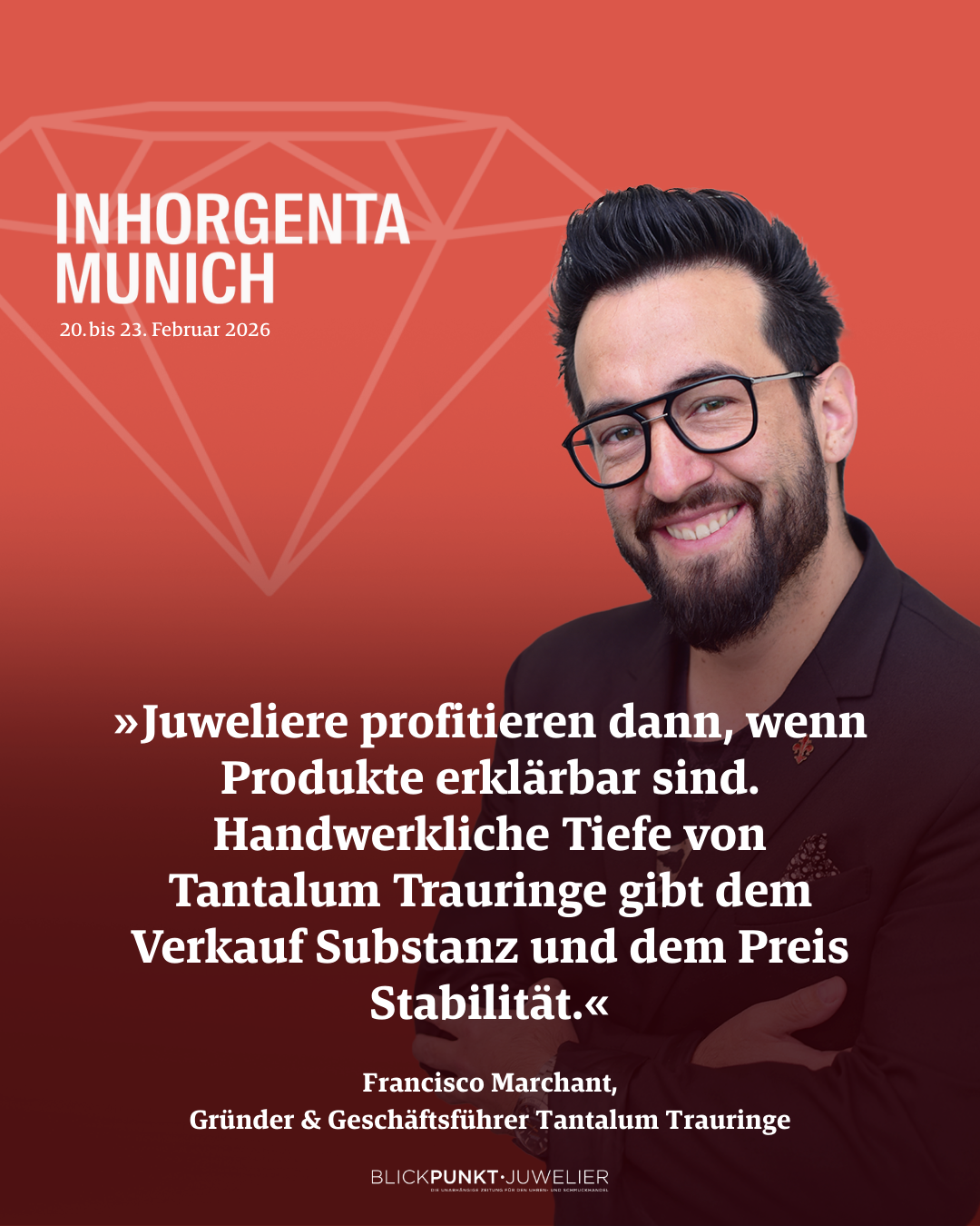 Kein Trendbericht, keine Effekthascherei. Was Tantalum Trauringe und Diamantal auf der INHORGENTA 2026 zeigen, ist eine bewusste Gegenbewegung zur schnellen Inszenierung. Geschäftsführer und Gründer Francisco Marchant spricht über Handwerk als Haltung, über Materialien mit Charakter und über Schmuck, der nicht erklärt werden muss, sondern verstanden werden will. Im Mittelpunkt stehen Zeit, Substanz und eine Pionierarbeit, die es so noch nicht gab: die weltweit erste Verlobungsring-Kollektion aus Tantal.