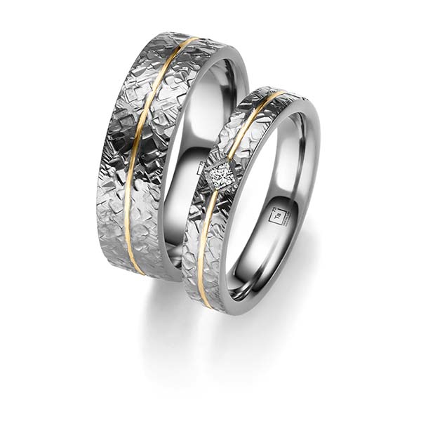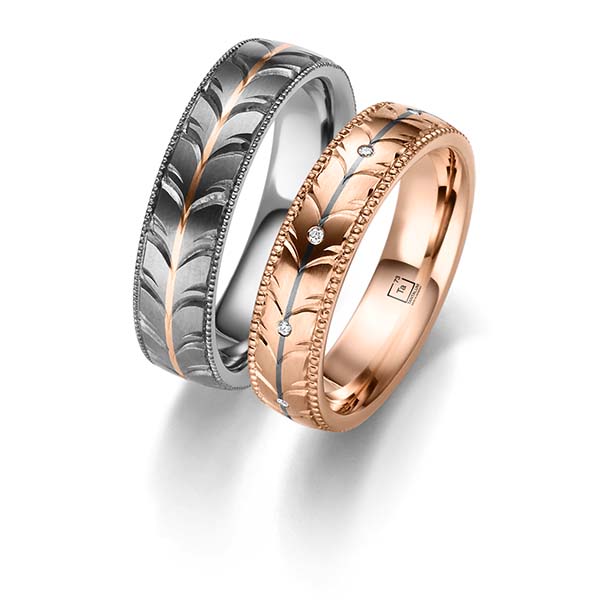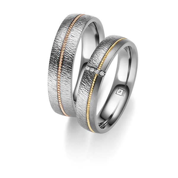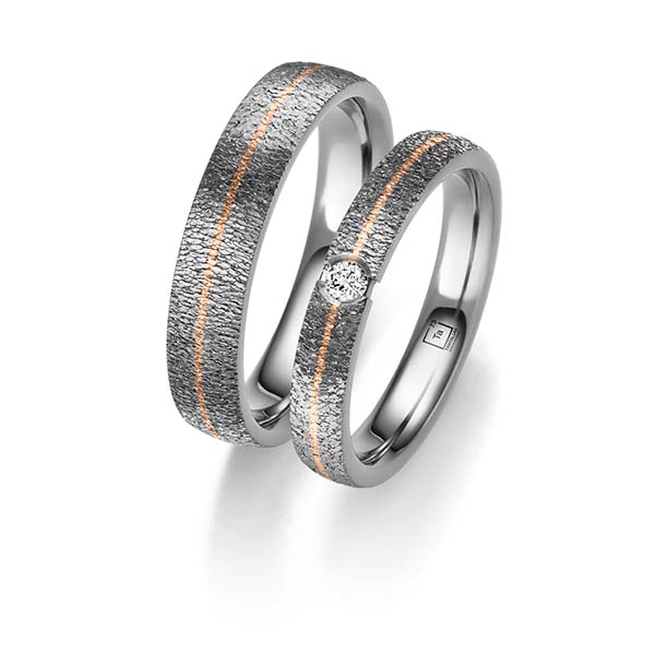 Tantal-Trauringe mit Goldeinlage, Diamanten, Perlfuge-Oberfläche // Tantal-Trauringe mit Goldeinlage, Diamanten, Shine-Oberfläche // Tantal- und Rotgold-Trauringe mit Rotgold- und Tantaleinlage, Diamanten, Runningleaf-Oberfläche © Tantalum Trauringe