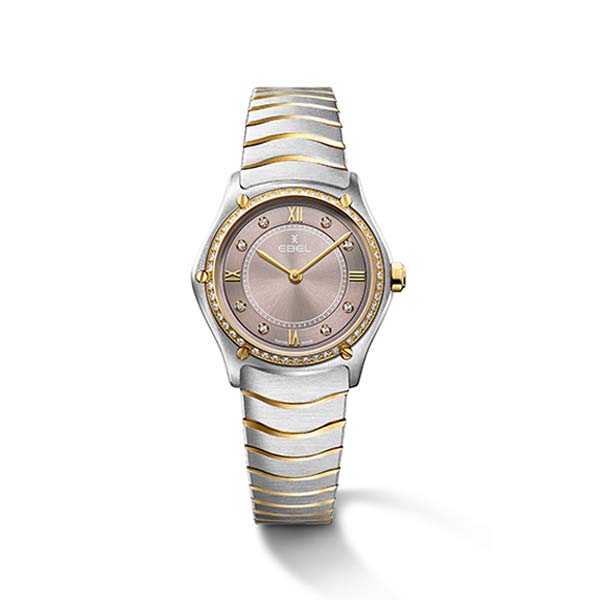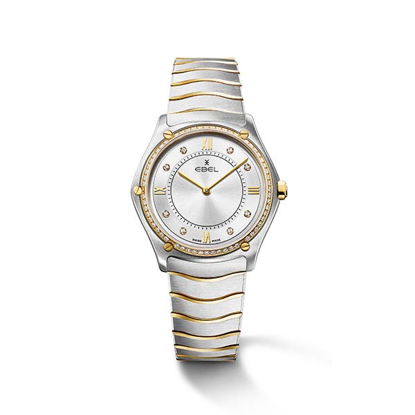 EBEL NEUHEITEN 2026: EBEL Sport Classic: Gehäuse aus Edelstahl und 18K Gelbgold mit 59 Diamanten, Ø 33 mm, weiß-silbernes Zifferblatt mit applizierten römischen Ziffern und 8 Diamanten, innenseitig entspiegeltes Saphirglas, Wellengliederarmband aus Bicolor-Edelstahl, Schweizer Quarzwerk, wasserdicht bis 5 bar // EBEL Sport Classic: Gehäuse aus Edelstahl und 18K Gelbgold mit 47 Diamanten, Ø 29 mm, taupefarbenes Zifferblatt mit applizierten römischen Ziffern und 8 Diamanten, innenseitig entspiegeltes Saphirglas, Wellengliederarmband aus Bicolor-Edelstahl mit Faltschließe, Schweizer Quarzwerk, wasserdicht bis 5 bar © EBEL