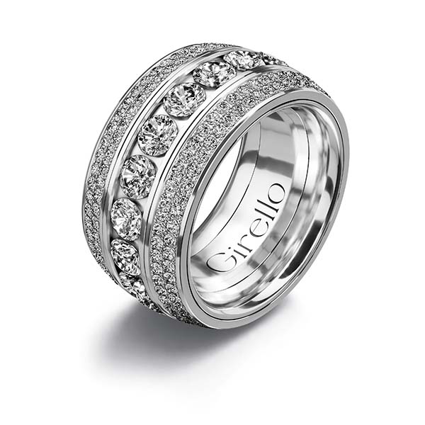 GIRELLO Drehring „Infinity“ aus 750er Roségold und 950er Platin mit 376 Brill. 2.18 ct. // GIRELLO Drehring „Cosmopolitan“ aus 950er Platin mit 260 Brill. 5.63 ct. © GIRELLO