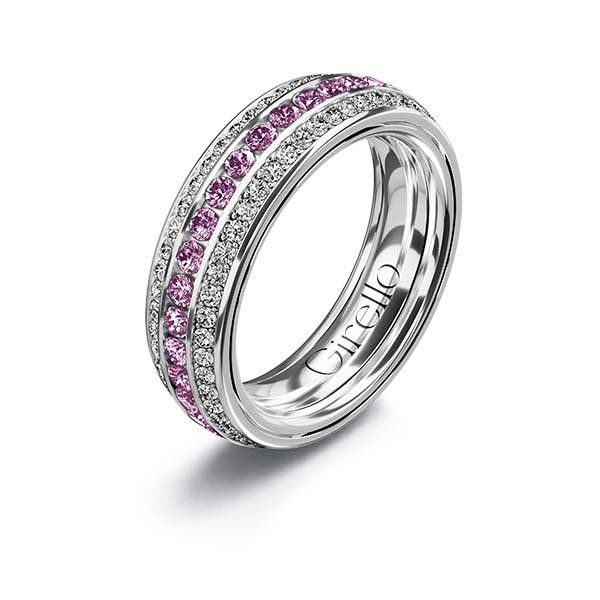 GIRELLO Drehring „Flames“ aus 750er Gelbgold mit 56 Brill. 0.43 ct. // GIRELLO Drehring „Shades“ 950er Platin mit 35 rosa Saphiren 1.20 ct. und 104 Brill. 0.97 ct. © GIRELLO
