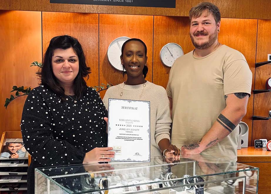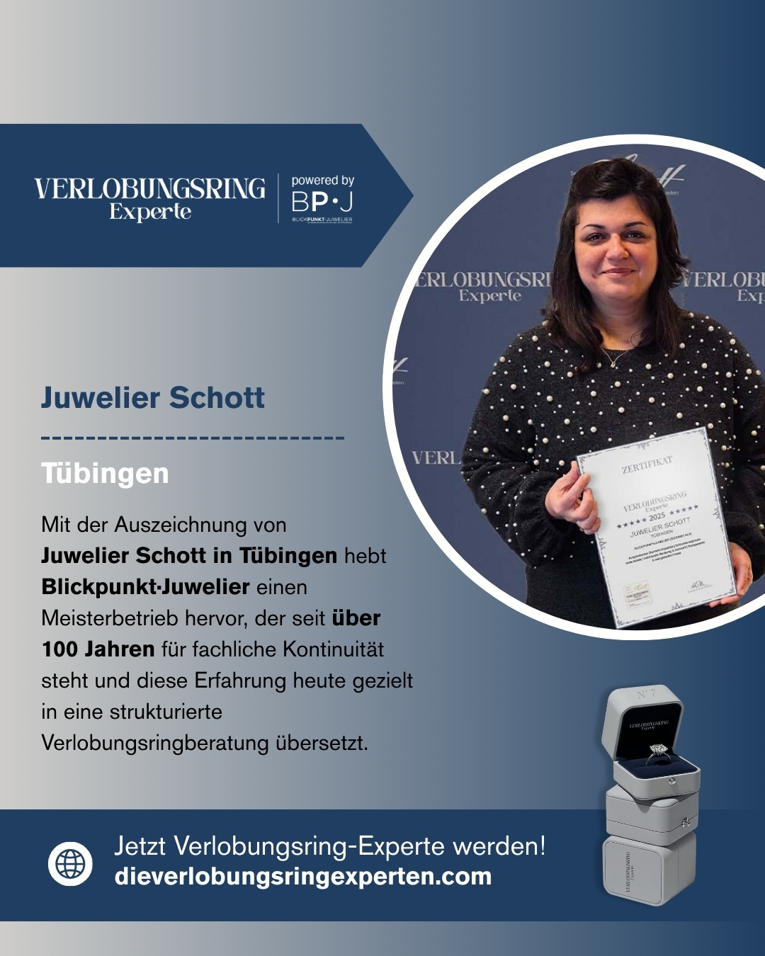 Mit der Zertifizierung von Juwelier Schott in Tübingen würdigt Blickpunkt·Juwelier einen Meisterbetrieb, der seit über 100 Jahren für fachliche Kontinuität steht und diese Erfahrung heute gezielt in eine strukturierte Verlobungsringberatung übersetzt.