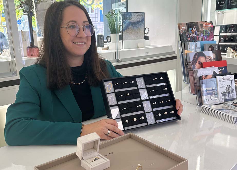 Blickpunkt·Juwelier gratuliert Ramona Schwaiger von City Juwelier NewLine in Landshut zur Auszeichnung als Verlobungsring Expertin. Mit der offiziellen Auszeichnung zählt das Geschäft in der Altstadt nun zu den zertifizierten Adressen, an die sich viele Männer bei der Wahl des Verlobungsrings wenden. Für den Fachhandel ist dies ein Beispiel dafür, wie klare Kompetenz, Sortimentsstärke und strukturierte Beratung zu messbaren wirtschaftlichen Ergebnissen führen.