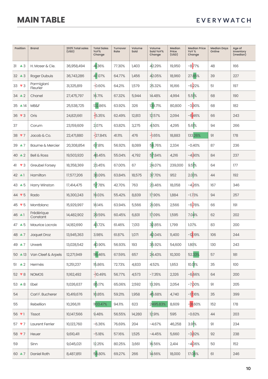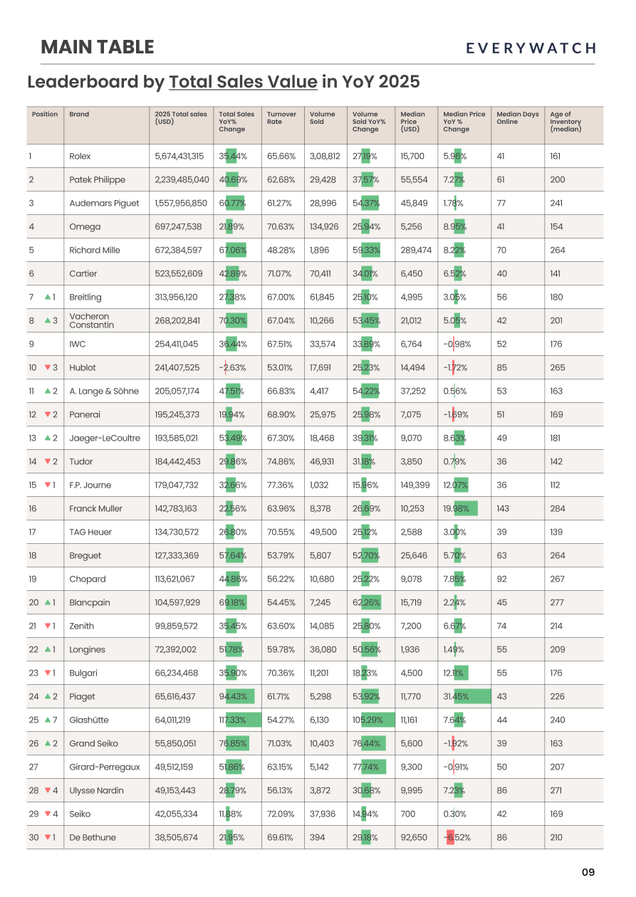 Independent Watchmaking wächst, aber nicht flächendeckend. Total Value Sold für Independents lag laut Report bei rund 407,9 Millionen US Dollar, plus 25,6 Prozent. Innerhalb der Gruppe dominiert F.P. Journe mit 179,0 Millionen US Dollar, plus 32,7 Prozent. Die Turnover Rate liegt bei 77,36 Prozent, die medianen Days on Market bei 36 Tagen. EveryWatch hebt hier einen wichtigen Punkt hervor: Eine Uhr mit 150.000 US Dollar Medianpreis war leichter zu verkaufen als eine 3.500 US Dollar Uhr. Liquidität ist damit kein reines Preisphänomen, sondern ein Vertrauens und Nachfragephänomen.