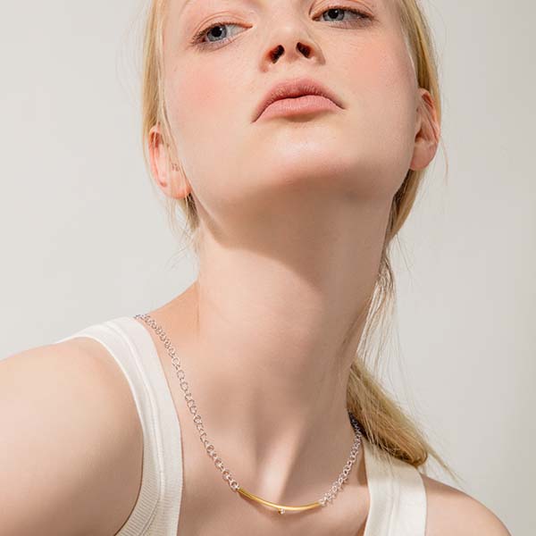 Beginnen wir die neue Linie mit einem grafisch klaren Armreifen aus 925er Silber und 900er Gold (AR120). Das warme Gold wird nicht galvanisch aufgetragen, sondern als echtes Material aufgebracht. Dadurch entsteht ein Bicolor-Effekt mit Dauerhaftigkeit und hohem Wiedererkennungswert. Dazu kommen schlanke Ringentwürfe mit präzise gesetzten Brillanten. Sie wirken einzeln zurückhaltend und entfalten im Stack ihre architektonische Wirkung. Die neuen Ringe sind ideal, um Einstiegs- und Upgrade-Käufe über Staffelpreise und Anlasskommunikation zu aktivieren. Ergänzt wird die Kollektion von Halsschmuck-Highlights wie dem Collier K1535 in Silber/Gold sowie der Kette K1527BR, die einen feinen Diamantakzent (0,012 ct) setzt. Hinzu kommt eine Wechselkette aus mehrfarbigen Turmalin oder eine Zopfkette mit Brillant. Auch Ohrstecker, mal voluminös in Gold oder Silber oder filigraner mit Brillanten zählen zu den Neuzugängen. Die neuen Schmuckstücke erzeugen visuelle Ruhe aus der Distanz und spürbare Spannung in der Nähe. Eine Stärke, die MANU über einzigartige Oberflächenstrukturen konsequent ausspielt.