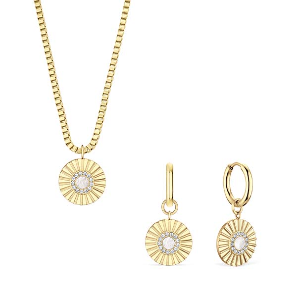 BERING Arctic Flowers Collection – Arctic Flowers Set Gold-White: Glänzendes Goldfarbenes Edelstahl-Schmuckset mit Kette, 45 cm, veredelt mit Perlmutt- und Kristallglas-Elementen. Elegant, modern und zeitlos. // BERING Polar Animal Collection – Polar Bears Set: Goldfarbene Edelstahl-Halskette mit Charms, veredelt mit weißen Kristallglassteinen im Pavé-Stil. Länge: 45 cm. Elegant, modern und zeitlos. // BERING Ceramic Collection: Elegante Keramikuhr mit flachem Saphirglas, präzisem Quarz-Uhrwerk und goldfarbenem Edelstahlarmband mit Keramikelementen. Das Sunray-Zifferblatt verleiht dem Design eine edle Tiefe. Wasserdicht bis 3 ATM – stilvoll und zeitlos. © BERING