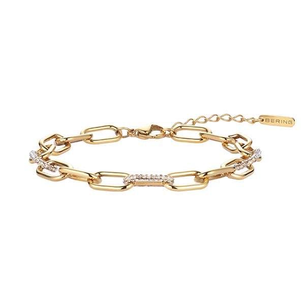 BERING Arctic Link Collection: Goldfarbene Edelstahl-Halskette, 45 cm und goldfarbenes Edelstahl-Armband, 18 cm, teilweise mit weißen Kristallglassteinen im Pavé-Stil veredelt. Elegant, modern und zeitlos. // BERING Arctic Pearls Collection – Arctic Pearl Set Gold: Goldfarbenes Edelstahl-Schmuckset mit synthetischer Perle, Kette 50 cm, veredelt mit funkelnden Zirkonia-Steinen. Elegant, modern und zeitlos. © BERING