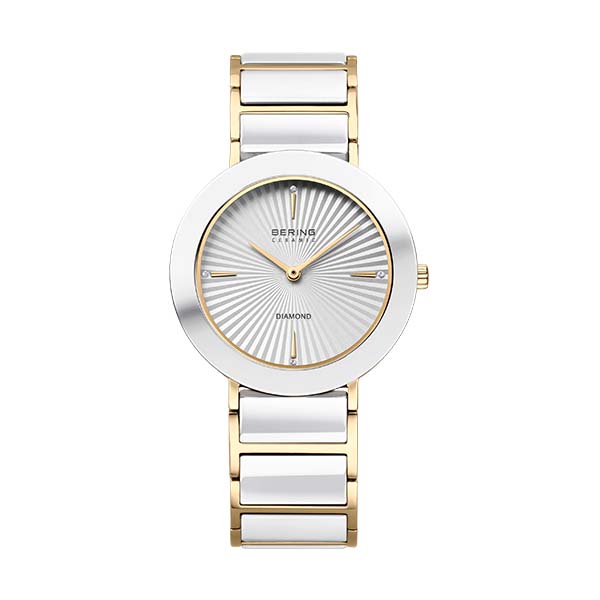 Im Uhrensegment steht die Ceramic Collection im Fokus. Die Keramikuhr mit flachem Saphirglas, Quarzwerk und goldfarbenem Edelstahlband mit Keramikelementen kombiniert ein Sunray Zifferblatt mit einer Wasserdichtigkeit von 3 ATM.