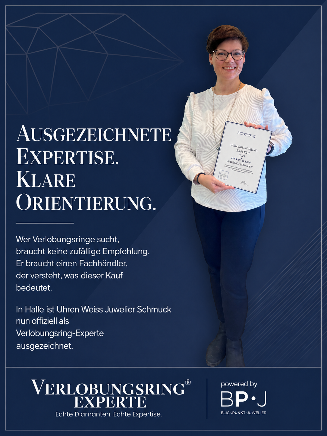 Mit der Auszeichnung als Verlobungsring-Experte wird Uhren Weiss Juwelier Schmuck für Halle und die Region als spezialisierter Ansprechpartner sichtbar. Das Programm von Blickpunkt·Juwelier unterstützt Fachhändler dabei, das Verlobungsringgeschäft als eigenständiges Segment aufzubauen. Dazu zählen Zertifikat und Plakette, lokale Sichtbarkeit, SEO optimierte Präsenz, Social Media Content, Marketingmaterialien und qualifizierte Kundenanfragen über die Plattform.