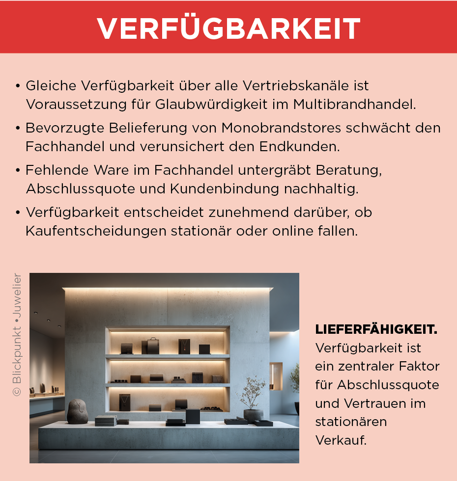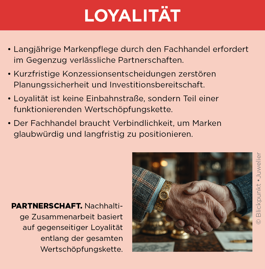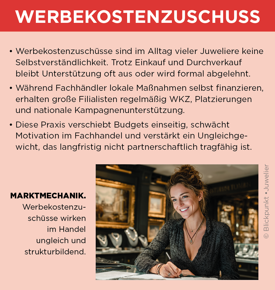 Der Juwelier agiert im Markt mit klar begrenzten Mitteln. Werbekostenzuschüsse werden nur eingeschränkt oder gar nicht gewährt, Kommissionsmodelle sind unüblich. Die Sortimentsgestaltung ist häufig nicht frei, sondern durch Vorgaben, Mindestabnahmen oder eingeschränkte Lieferfähigkeit limitiert. Gleichzeitig trägt der Juwelier die volle Verantwortung für Lagerhaltung, Personal, Service und Aftersales. Er erklärt Herkunft, Qualität und Preis, übernimmt Reparaturen, Batteriewechsel und ist erster Ansprechpartner bei Reklamationen. Digitale Sichtbarkeit entsteht meist auf eigene Kosten, nationale Kampagnen bleiben die Ausnahme. Trotz regionaler Kompetenz und Kundennähe wird der Fachhandel oft als nachgelagerter Absatzkanal behandelt, obwohl er Marken vor Ort aufbaut, pflegt und dauerhaft sichtbar hält.