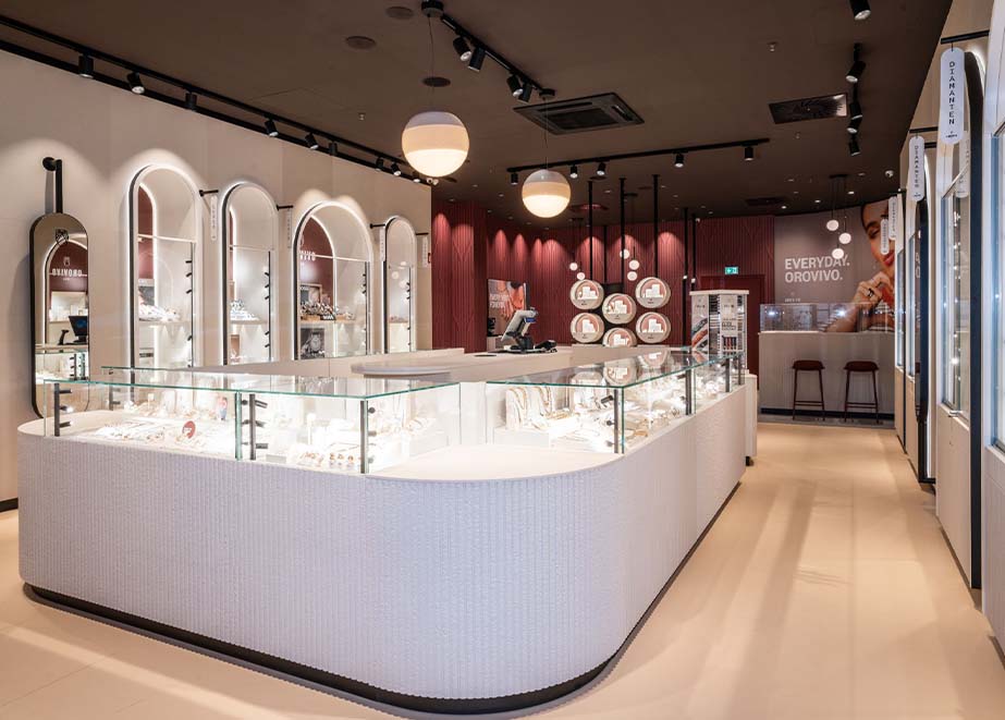 Besonders prägend beim neuen Store-Design sind die warmen Farbwelten aus Rostbraun, Beige und Creme, geschwungene Linien, dezente Lichtführung und runde Vitrinen. Der Fokus liegt klar auf der emotionalen Wirkung des Schmucks, unterstützt durch großflächige Visuals und eine reduzierte Kommunikationslinie, die der Marke Profil verleiht. OROVIVO positioniert sich damit als moderner Juwelier, der ein zugängliches, aber hochwertiges Markenerlebnis schafft.