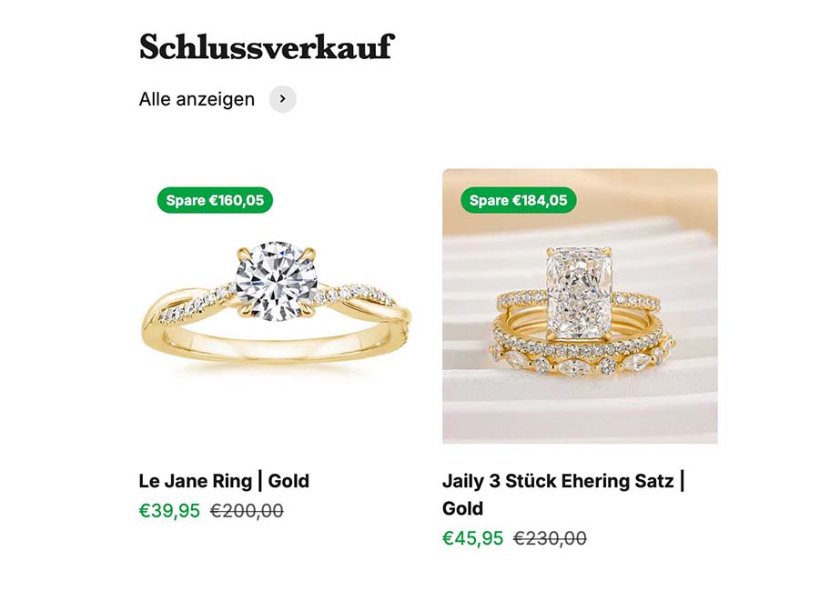 Preisanker zerstört Marge: −60 % bis −80 % „Räumung“ verschieben die Zahlungsbereitschaft – Beratungsgespräche enden öfter mit „Ich habe das online viel günstiger gesehen“. Vertrauenssimulation: Paar-Bildsprache, Atelier-Narrativ, „Letzte Chance“-Countdowns und .com-Shops mit Hochglanz-CI erzeugen Glaubwürdigkeit ohne reale Infrastruktur. Funnel-Effekt: Aggressive Social-Ads + Checkout mit Sofortzahlung → schneller Cash-In für Betreiber, während Rekla und Chargebacks beim Payment-Provider landen – und die Enttäuschung bei Kund:innen später im lokalen Geschäft.