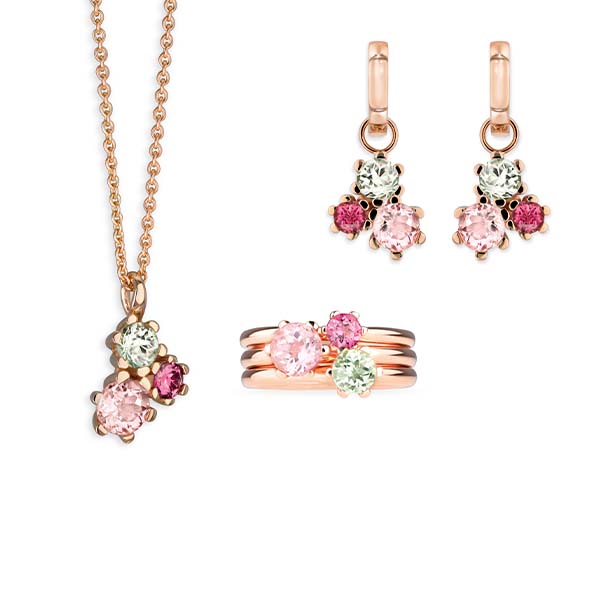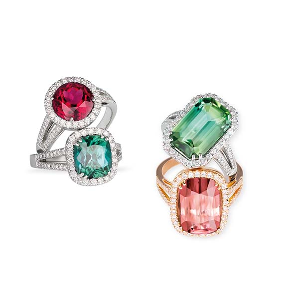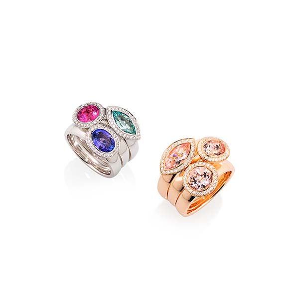 Mix+ Match, Turmaline in 750 Roségold // Ohrschmuck mit Paraiba-Turmalin in 750 Weißgold mit Brillanten // Triple Ringe, Tansanit, pinker Turmalin, grüner Beryll in Weißgold mit Brillanten in 750 Weißgold Morganit in 750 Roségold mit Brillanten © RHB