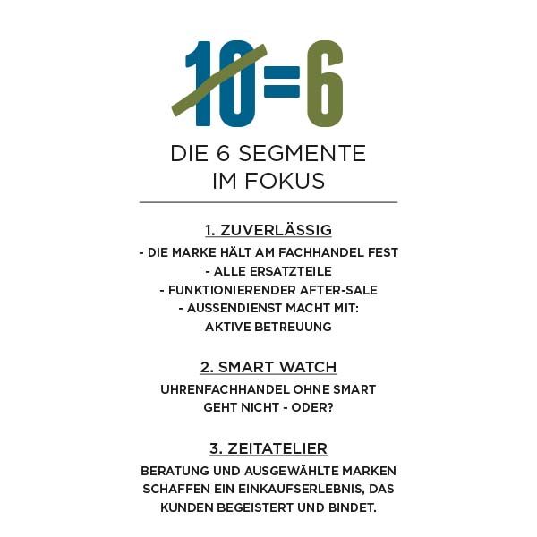 Damit beginnt ein Teufelskreis, in dem der stationäre Handel zunehmend an Glaubwürdigkeit verliert. Kunden erwarten heute weit mehr als bloß das reine Produkt, sie wollen kompetente Betreuung auch nach dem Kauf. Fehlt diese Betreuung, sinkt das Vertrauen rapide – und der Uhrenkauf verlagert sich ins Netz. Nicht weil man dem Händler schaden will, sondern weil Kunden gelernt haben, dass ihnen der lokale Experte in solchen Fällen nicht weiterhelfen kann. Der Fachhandel muss also weitsichtig reagieren, was ihm bestens mit dem „6 statt 10“-Prinzip gelingt.