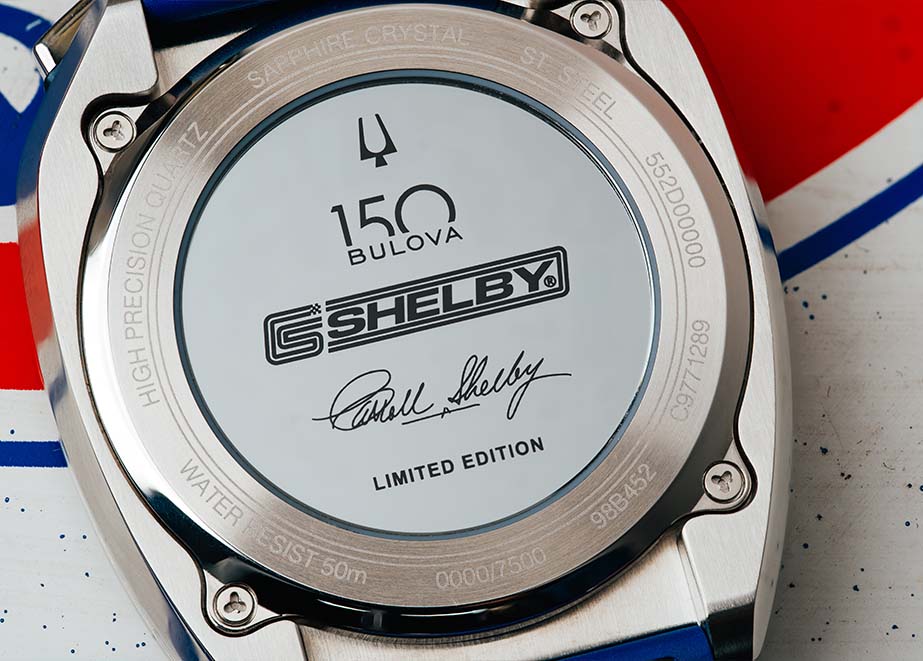 Zum 150-jährigen Jubiläum bringt Bulova gemeinsam mit Shelby® einen Bullhead-Chronographen (7.500 Stück, UVP 1.250 €). Das 43-mm-Edelstahlgehäuse mit Krone/Drückern bei 12 Uhr, Tachymeter, antireflex-Saphirglas und geriffeltem Mittelteil zitiert klassische Handstoppuhren. Im Inneren arbeitet das hauseigene High-Performance-Quartz „Precisionist“ (Kaliber NN10, 262 kHz) mit fließendem Chrono-Sekundenzeiger. Blau-weißes Shelby-Farbschema, Cobra-Logo im Totalisator und ein beiliegendes 1:24-Modell des Mustang GT500 positionieren die Uhr klar im Gift-/Sammler-Segment; das Band besteht aus HNBR-Kautschuk.