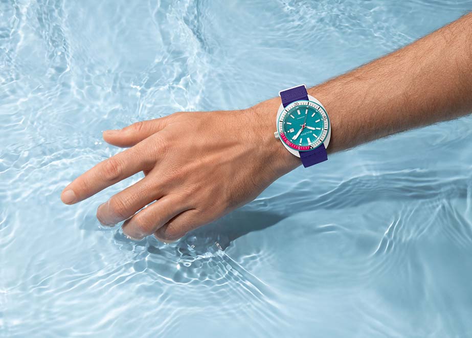 Die neue Snorkel Limited Edition (3.000 Stück, UVP 299 €) setzt auf ein 41-mm-Gehäuse aus Hybrid-Keramik, doppelt gewölbtes Mineralglas und 10 bar Wasserdichtheit. Eyecatcher sind das türkisfarbene Wellen-Zifferblatt, die zweifarbige Drehlünette sowie das Armband aus #tide ocean material® – recyceltem Meeresplastik mit bis zu 80 Prozent weniger CO₂ gegenüber Neuplastik. Ein Edelstahl-Boden mit Korallenriff-Gravur und individueller Nummerierung runden das Paket ab. Quarz-Kaliber 2115, Leuchtzeiger/-indizes und Datum machen die Uhr zur unkomplizierten „Fun-Watch“ mit starker Nachhaltigkeitsbotschaft für Schaufenster, Social Media und Geschenkefinder.