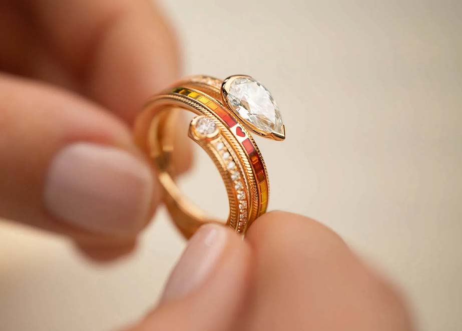 Mit dem Ring Diamanttropfen hat Wellendorff 2025 das Schmuckstück des Jahres vorgestellt. Ein Ring, der drei klassische Fassarten vereint und daraus etwas vollkommen Neues schafft. Pavéfassung, Zargenfassung und Einreiben verschmelzen zur sogenannten Spiegelglanzfassung. Unter jedem der 48 Diamanten befindet sich ein winziger polierter Spiegel von nur 1,5 mal 1,5 Millimetern. Diese Spiegel reflektieren das Licht und verstärken die Brillanz erheblich.
