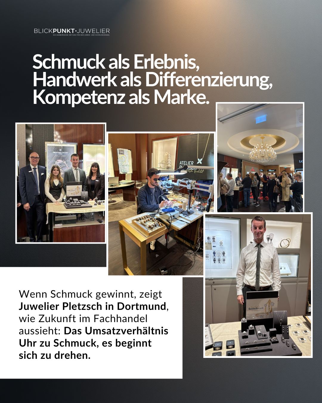 Unter dem Motto „Diamantenfieber bei Juwelier Pletzsch in Dortmund“ lud Geschäftsführer Joachim Dühring kürzlich zu einem besonderen Abend ein und bewies, dass Schmuck emotionaler, erlebnisreicher und margenstärker inszeniert werden kann als jede Uhr. Geladene Gäste erlebten live, wie ein erfahrener Diamantfasser aus Pforzheim einen Stein in ein Schmuckstück einsetzte. Präzision, Konzentration und Handwerkskunst wurden unmittelbar spürbar und damit genau das sichtbar gemacht, was Juweliere vom Filialisten unterscheidet: echtes Können. Begleitet wurde das Event von einem erlesenen Buffet, ausgewählten Getränken und einer exklusiven Präsentation von Schmuckstücken mit Diamanten bis zu 5 Carat. Das Ergebnis: ausverkauftes Haus, begeisterte Kunden und nachhaltige Resonanz.
