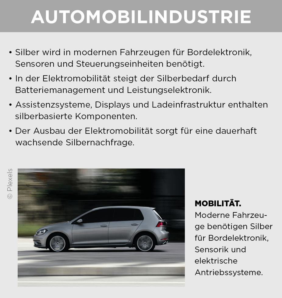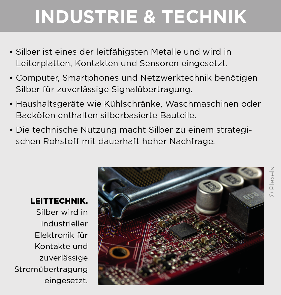 Industrie und Technologie sind zentrale Treiber der Silbernachfrage – sichtbar wird das auch im Schmuck selbst. Nicht vergoldeter Silberschmuck ist heute nahezu immer rhodiniert. Die Beschichtung schützt vor dem Anlaufen, erhöht die Oberflächenhärte und sorgt für einen dauerhaft hellen Glanz. Gleichzeitig zählt Rhodium zu den teuersten Edelmetallen weltweit, der Rohmetallpreis liegt bei rund 299,27 Euro pro Gramm. Das Rhodinieren eines Silberrings kostet je nach Größe und Ausführung etwa 50 bis 150 Euro pro Stück, wobei Arbeitsaufwand und Prozesssicherheit einen wesentlichen Teil der Kosten ausmachen. Über den Schmuck hinaus ist Silber aufgrund seiner physikalischen Eigenschaften in zahlreichen Schlüsselbranchen technologisch kaum ersetzbar. Elektronik, Mobilität, Energietechnik und Medizintechnik sorgen für einen stabilen und langfristigen Bedarf, der weitgehend unabhängig von modischen Zyklen ist. Gleichzeitig bleibt das Angebot begrenzt, da Silber überwiegend als Nebenprodukt gefördert wird. Diese Kombination aus struktureller Nachfrage und eingeschränkter Verfügbarkeit verleiht dem Markt Substanz und verändert die Rolle von Silber nachhaltig.