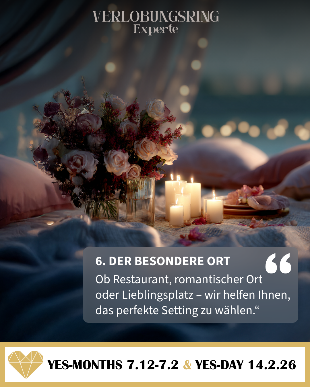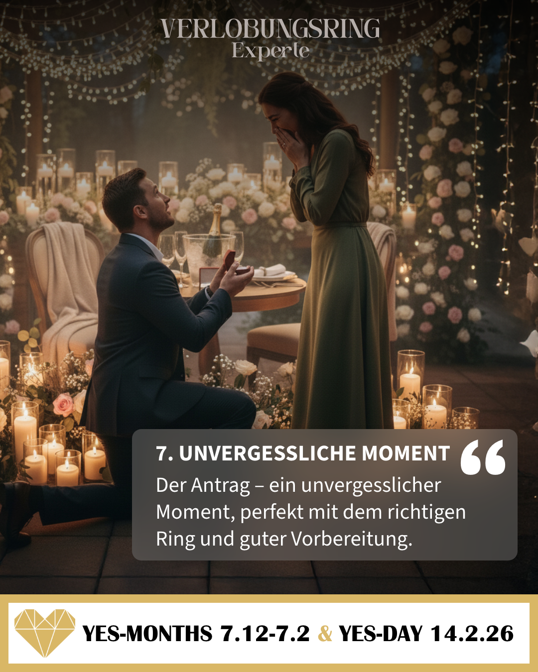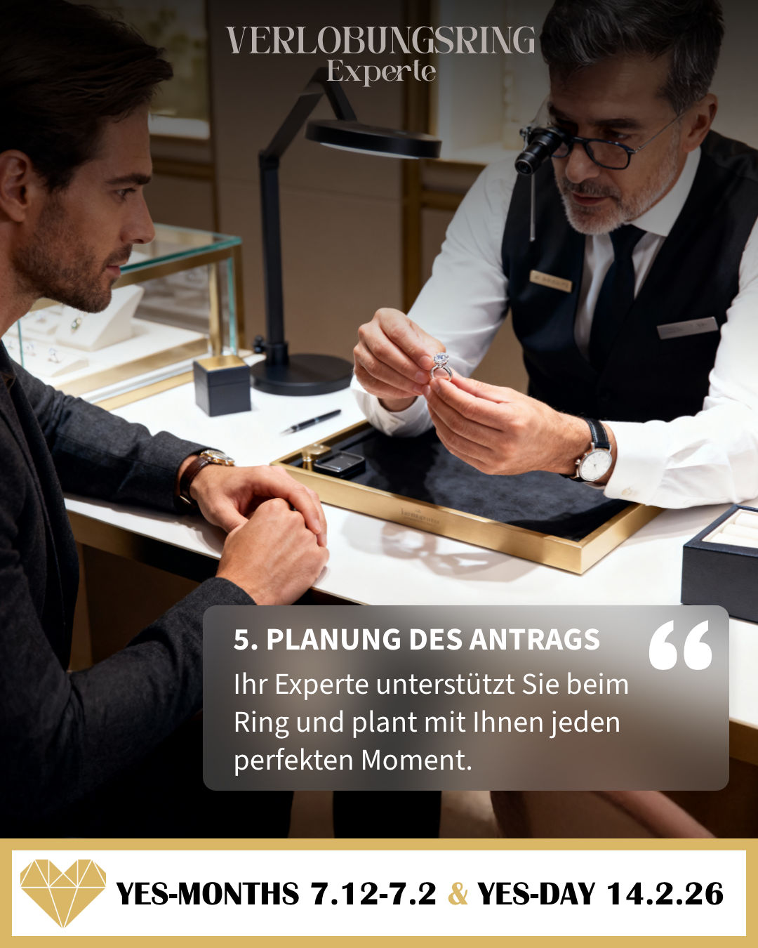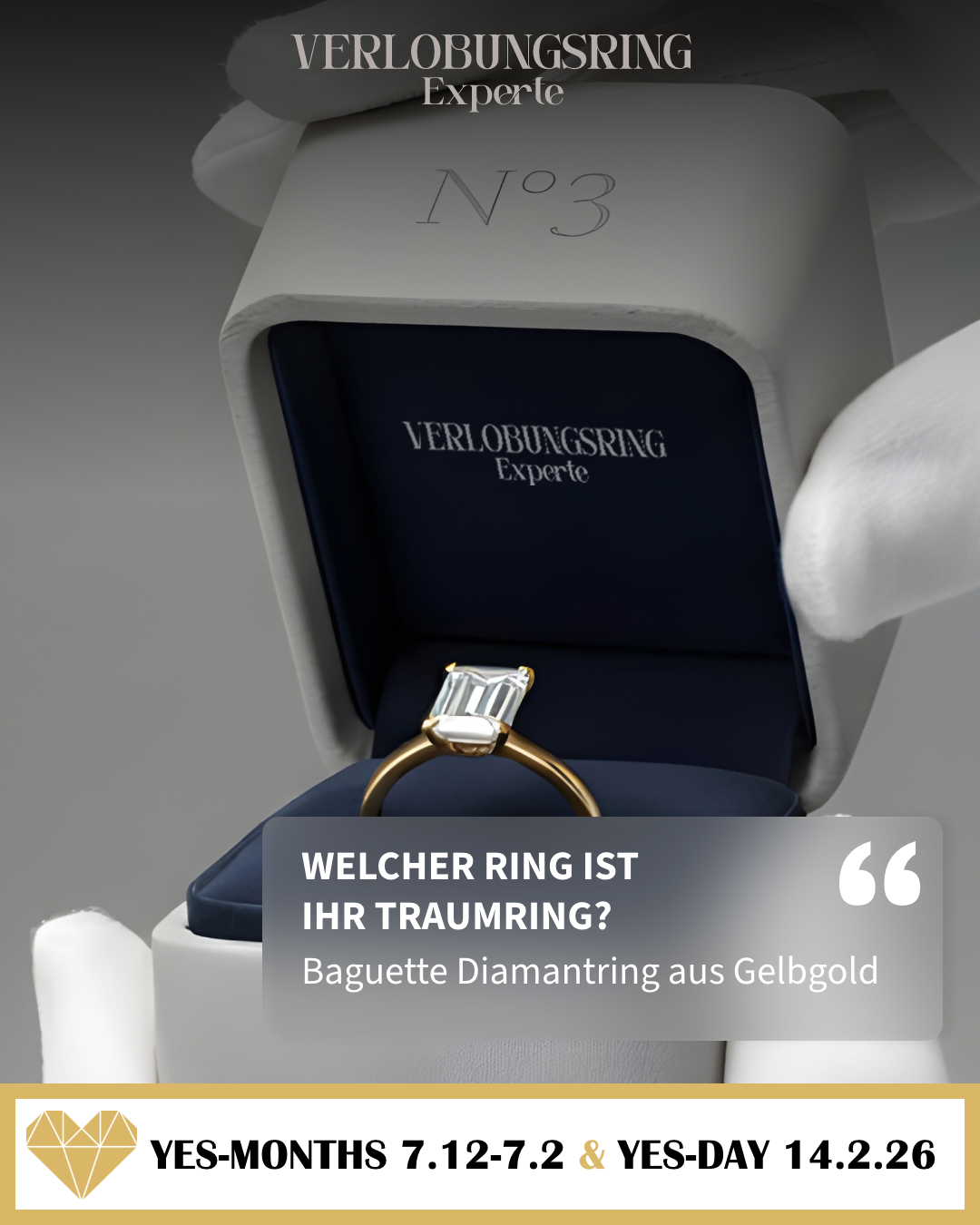 Der YES-MONTH! ist die wichtigste Verkaufsphase für Verlobungsringe. Er läuft vom 7. Dezember bis 7. Februar und umfasst damit jetzt auch noch den Kernmonat Januar. In diesem Zeitraum informieren sich viele Männer intensiver, vergleichen Modelle und treffen ihre Kaufentscheidung. Ziel ist es, rechtzeitig den passenden Ring zu finden, um am YES-DAY!, dem Valentinstag, den Antrag zu stellen.